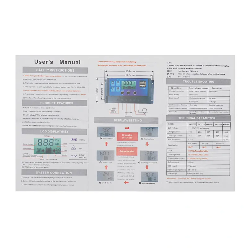 10/20/30/40/50A 12V/24V Light &Time Control Auto Adapte Solar Charge Controller Dual USB Port LED Indicator PWM Solar Controller