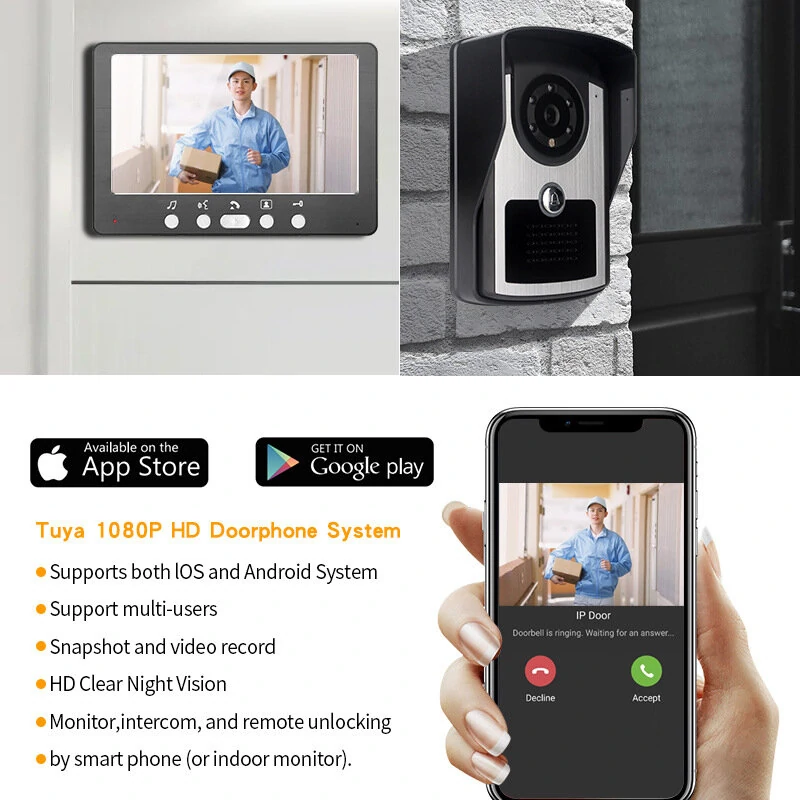 7 inch 1080P Tuya WiFi Video Intercom Doorbell System APP Remote Unlock Night Vision IP55 Waterproof Wireless Visual Doorbell with LCD Monitor for Home Apartment Security