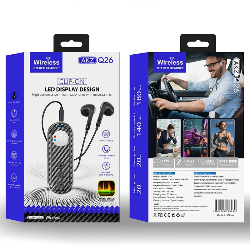 AKZ Q26 2-In-1 Wireless Lavalier Earphone Car bluetooth 5.4 Receiver Adapter Stereo Sound LED Digital Display Clips-on External Headphone