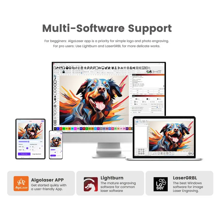 Frequently Asked Questions (FAQ) about This Algolaser Alphas MK2 20W Laser Engraver Diode Laser 20000mm/min Smart Touchscreen 32GB Storage Multi-Software Support