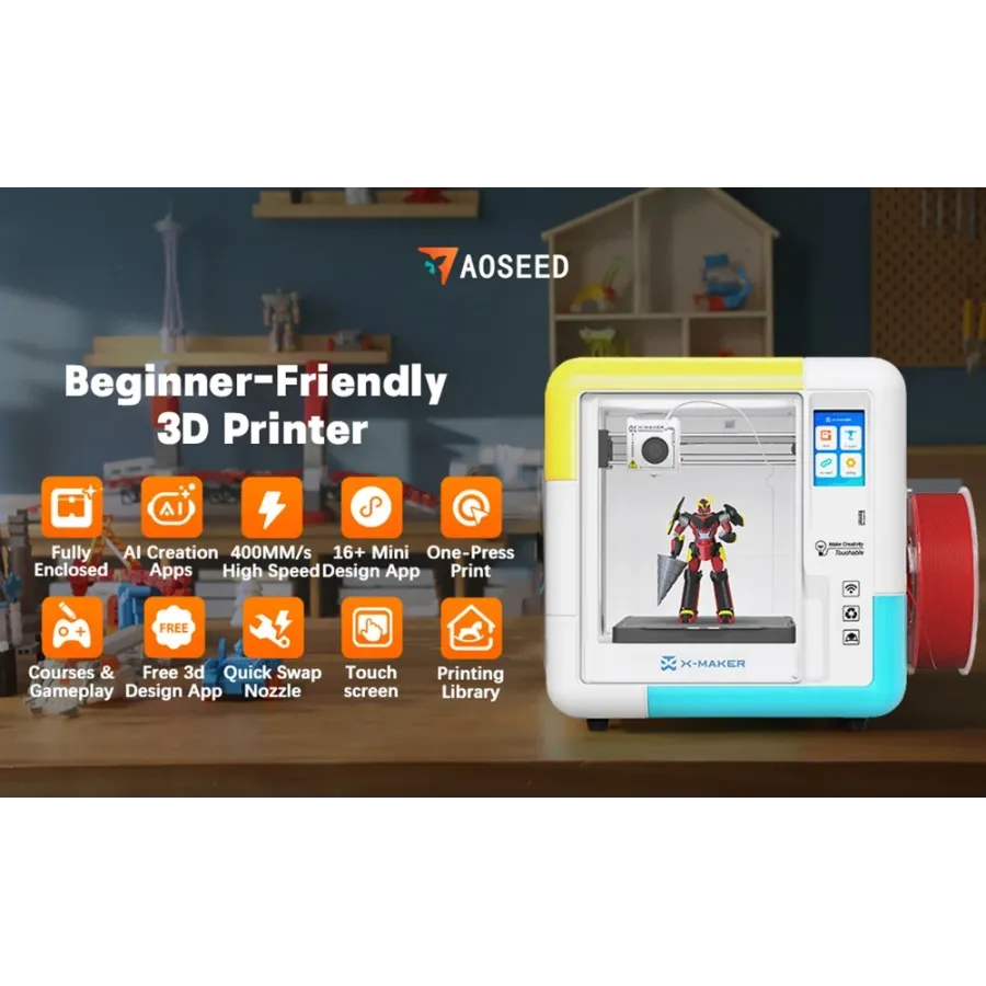 AOSEED X-MAKER AI Kids' 3D Printer V4.0 Fully Enclosed 0.05mm High Precision 400mm/s Fast Printing 150150150mm Build Volume Kids-Friendly with 16+ Creative Design Apps