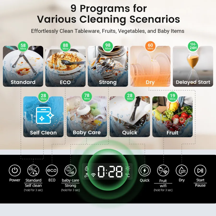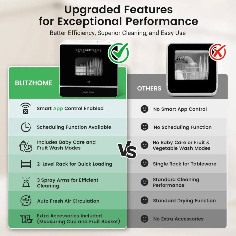Frequently Asked Questions (FAQ) about This BlitzHome BH-6-CDW1 Smart Portable Countertop Dishwasher With APP Control 5.2L Built-in Water Tank 9 Programs PTC Hot Air Drying 3D 360 3 Sprayers Water-Saving