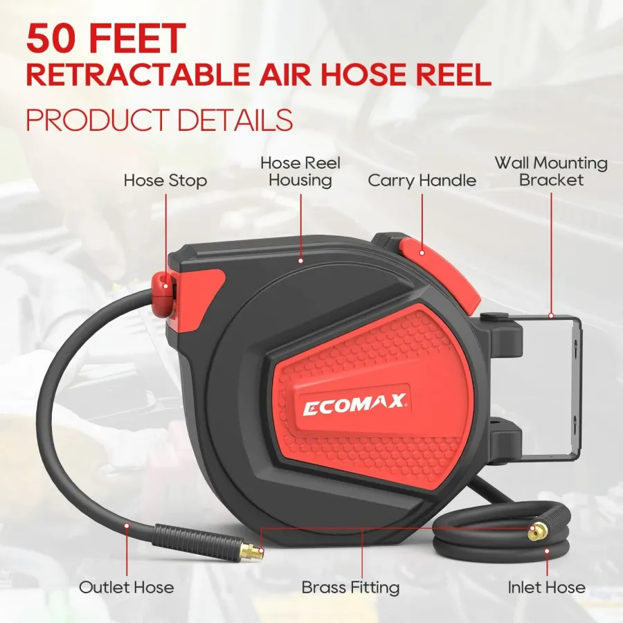 ECOMAX 3/8 in. x 50 ft Retractable Enclosed Air Hose Reel with Auto Rewind Heavy Duty Reel NPT 1/4 Inch Any Length Lock 180 Swivel Bracket MAX Pressure 348 PSI