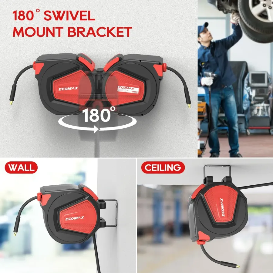 Frequently Asked Questions (FAQ) about This ECOMAX 3/8 in. x 50 ft Retractable Enclosed Air Hose Reel with Auto Rewind Heavy Duty Reel NPT 1/4 Inch Any Length Lock 180 Swivel Bracket MAX Pressure 348 PSI