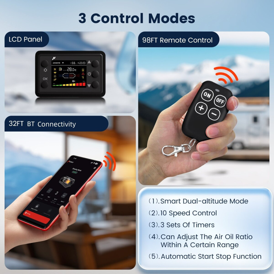 Frequently Asked Questions (FAQ) about This HCALORY HBU1S 8KW Diesel Heater 10L Parking Diesel Air Heater Fast Heating 12V/24V with Bluetooth App Control Automatic Start and Stop Multiple Timed Settings Altitude Mode for RV Garage 2025 Upgraded