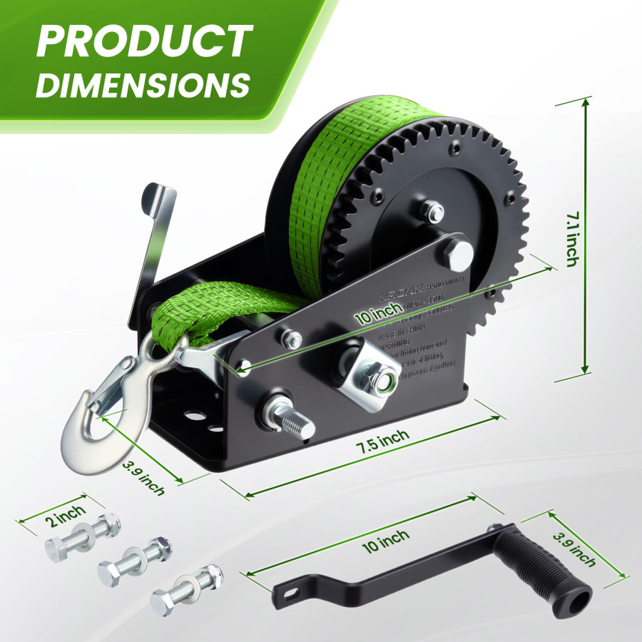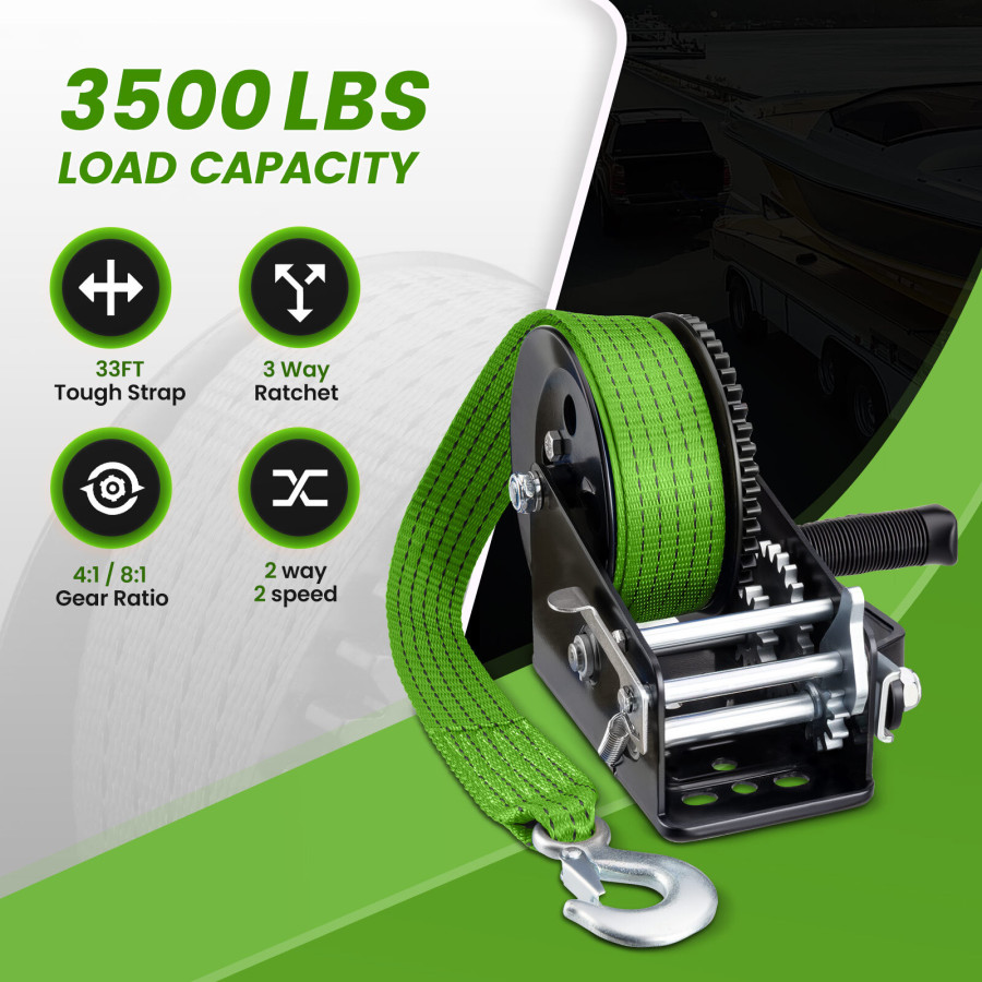 Frequently Asked Questions (FAQ) about This Heavy Duty 3500lbs Boat Trailer Winch with 33ft Green Strap Manual Winch Handle Dual Gear 4 1/8 1 Ratio for Boats Jet Skis Marine
