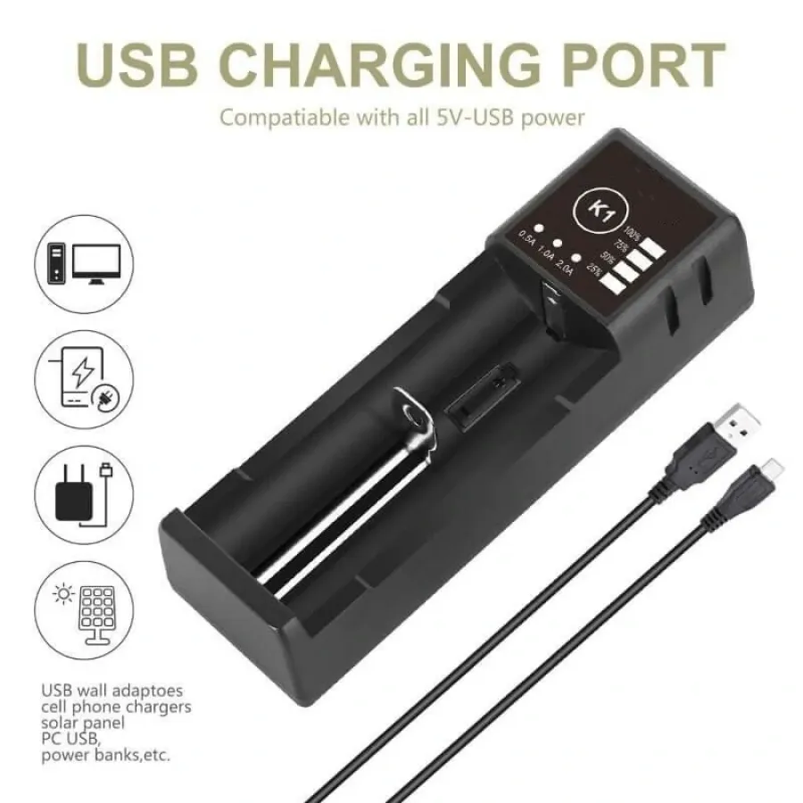 K1 Single Slot with USB Port Universal Li-ion Battery Charger Intellegent Charger for Flashlight RC Toys Home Tools Battery Charger For Li-ion 18650 21700 26650 AA AAA Batteries Cell