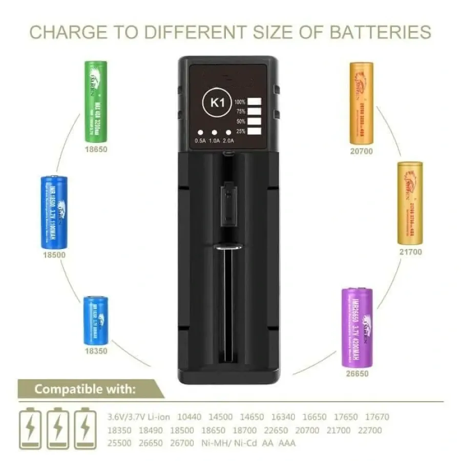 Frequently Asked Questions (FAQ) about This K1 Single Slot with USB Port Universal Li-ion Battery Charger Intellegent Charger for Flashlight RC Toys Home Tools Battery Charger For Li-ion 18650 21700 26650 AA AAA Batteries Cell