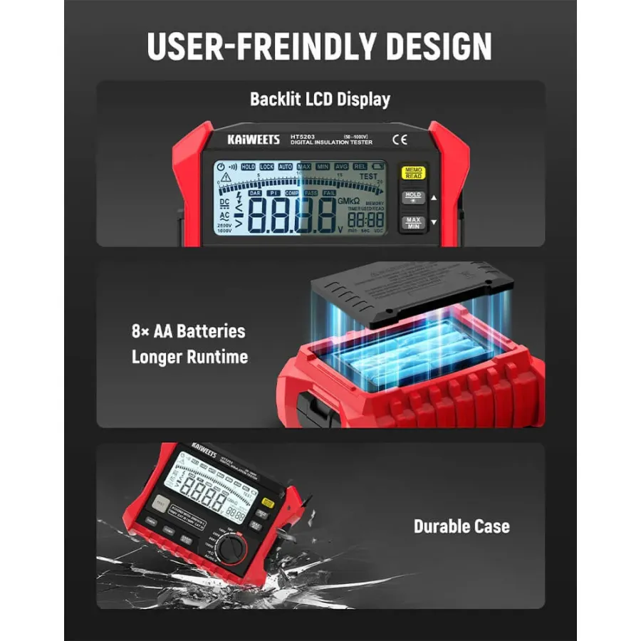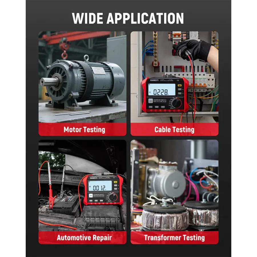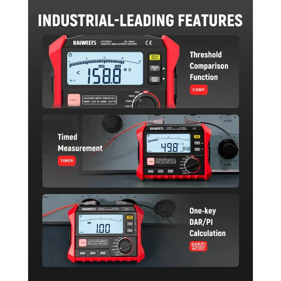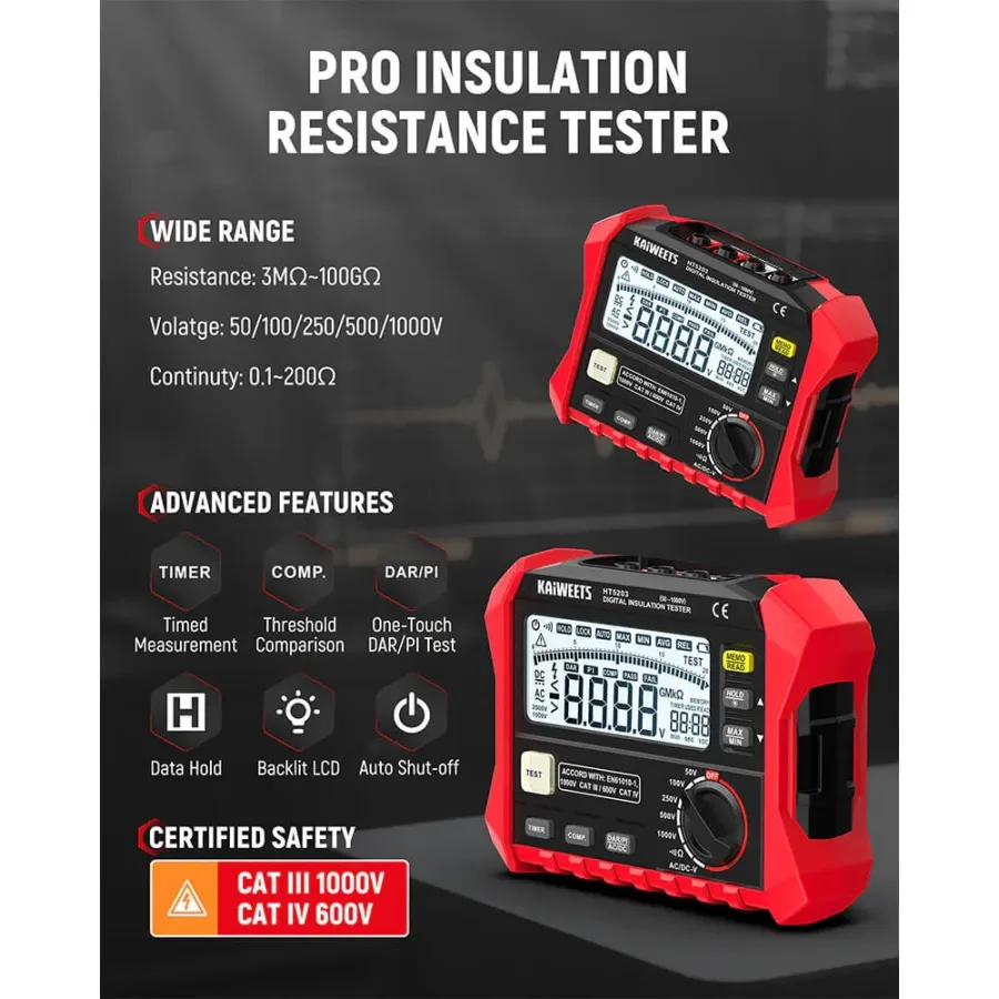 Frequently Asked Questions (FAQ) about This KAIWEETS KE1000 Insulation Resistance Tester 3M to 100G 750V AC 1000V DC Multimeter with DAR PI Auto Calculation for Industrial Testing