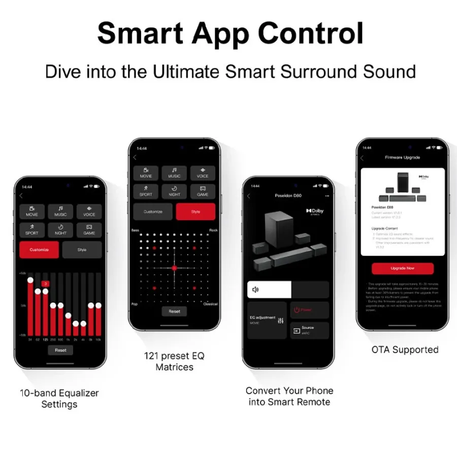 Frequently Asked Questions (FAQ) about This Refurbished Ultimea Poseidon D80 460W 7.1CH Soundbar 4 Wired Surround Speakers 6.5" Wireless Subwoofer BassMX SurroundX Technology 121 Preset EQ Matrices Home Theater Subwoofer Surround System