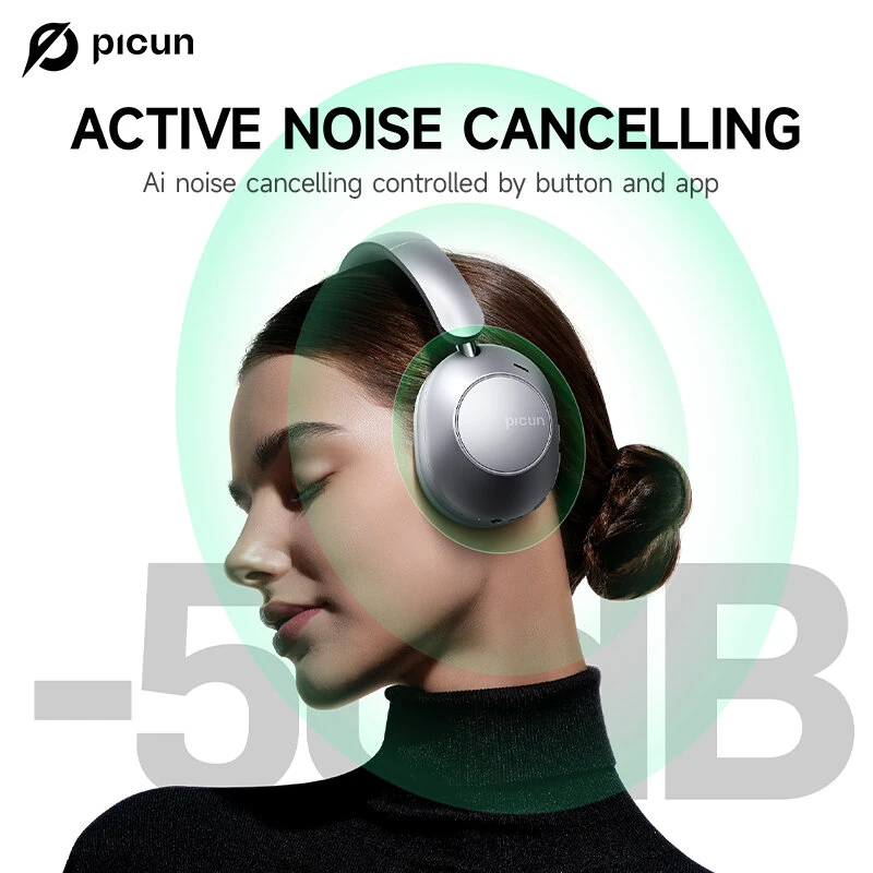 Picun F6 Wireless bluetooth Headset ANC Headphone -50dB Active Noise Cancelling 45mm Dynamic Drivers 120H Playtime Low Gaming Latency AUX Wired Headphones with Mic