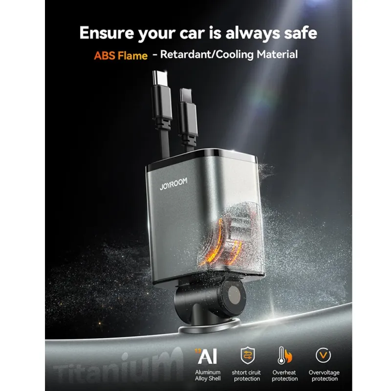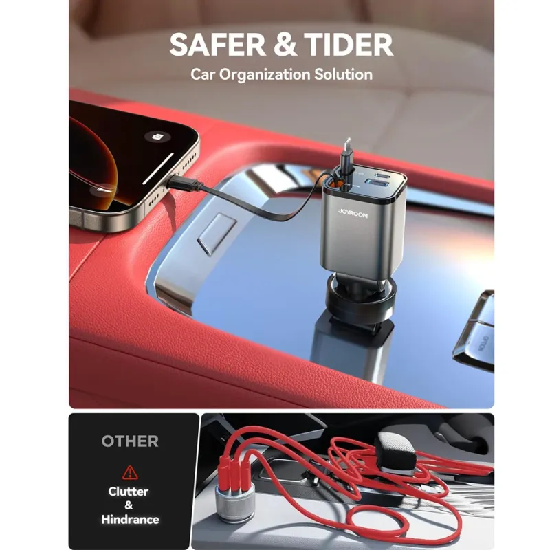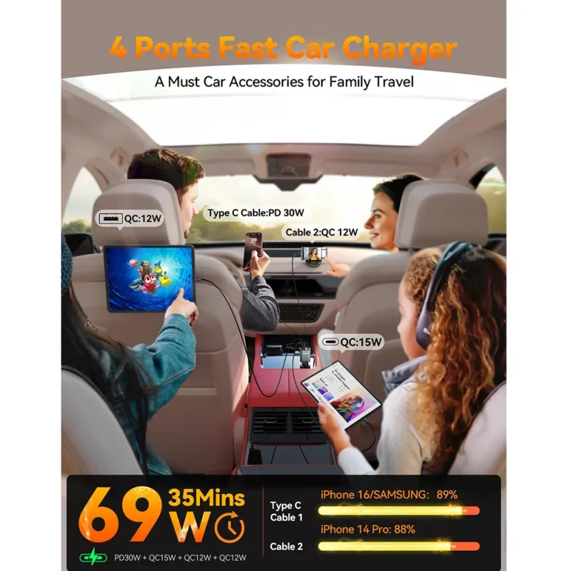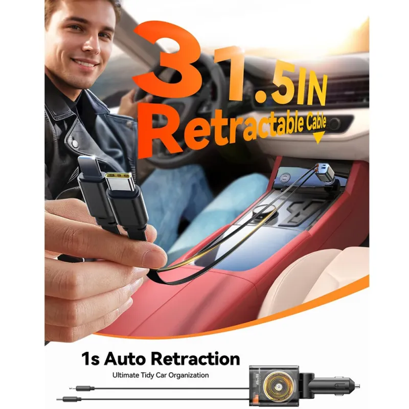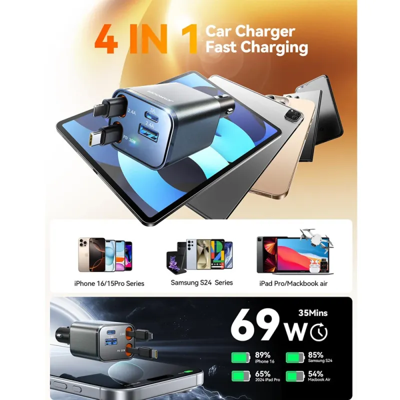4 in 1 Retractable Car Charger Adapter 69W 180 Rotatable Car Charger USB C Fast Charging for iP 16 15 14 13 12