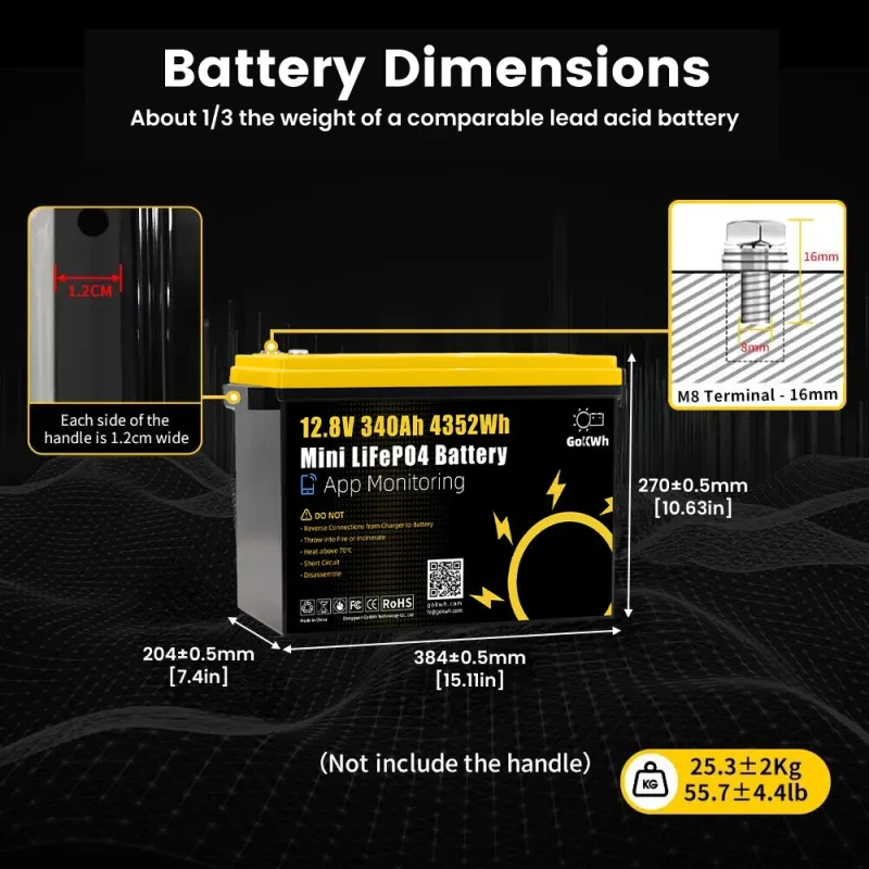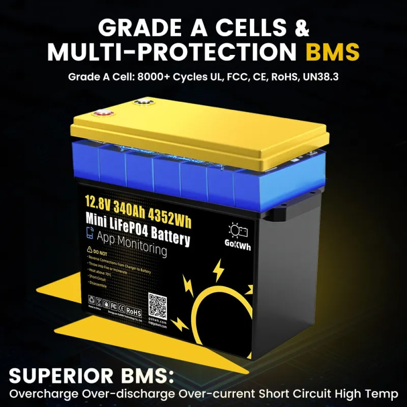 GOKWH 12V 340AH Vehicle Storage Box 4352Wh Mini LiFePO4 Battery Built-in 200A Bluetooth BMS