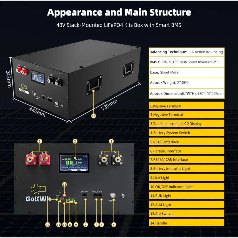 Gokwh 48V 320AH Energy Storage Box DIY Kit APP Bluetooth Remote Operation LED Bluetooth Status Indicator Charge Overcurrent Protection