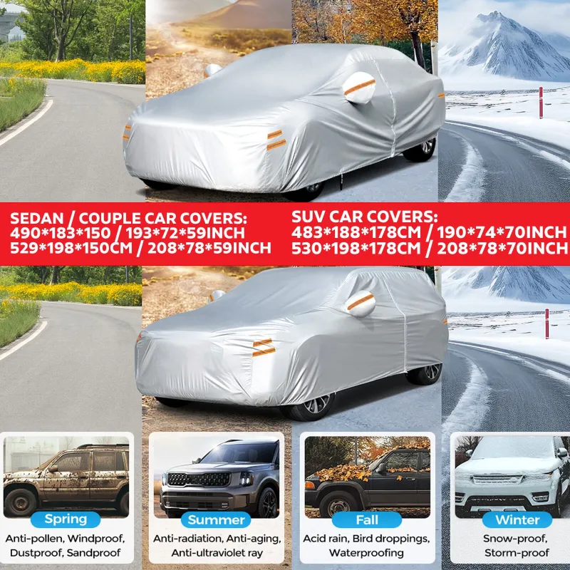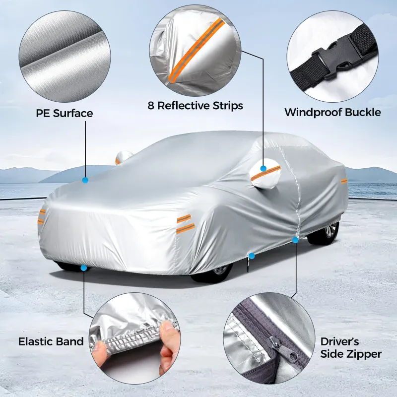 190T Polyester Car Full Covers All Weather Automobiles Outdoor With Windproof Strap 6 Reflective Strips for Sedans Coupes Silver UV Risistant Rainproof Dustproof Snowproof