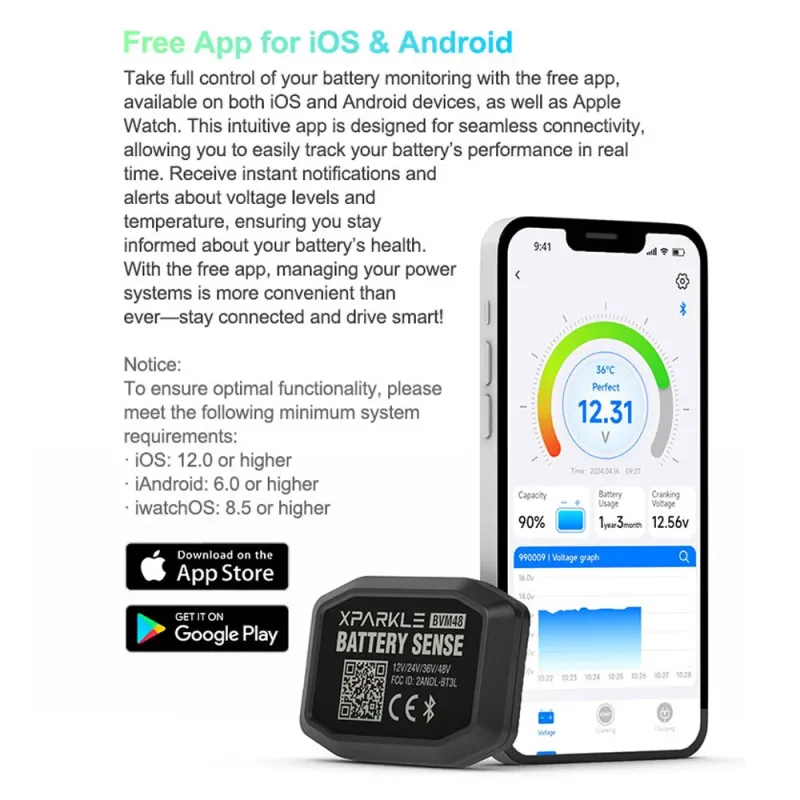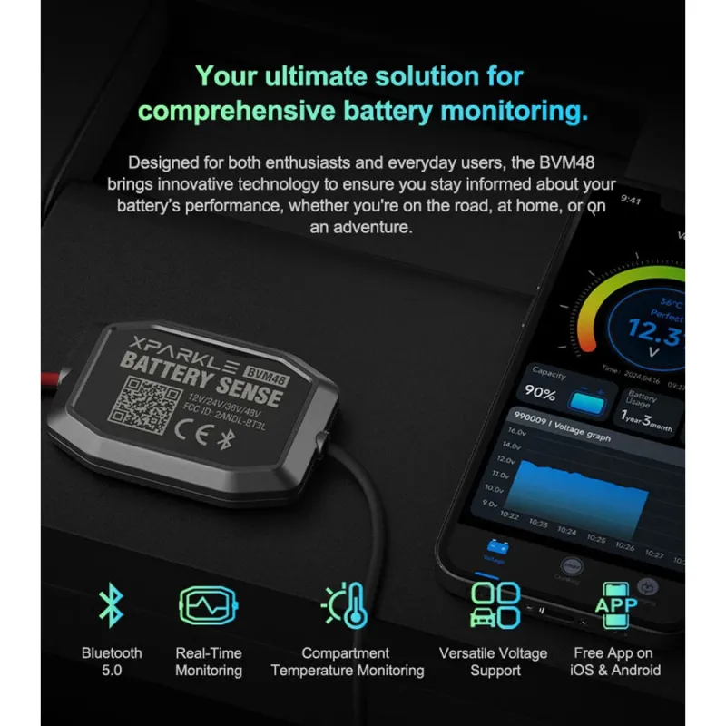 Xparkle BVM48 bluetooth Battery Monitor Real Time Monitoring for Cars Yachts Off-Road Vehicles Trucks RVs Golf Carts Electric Bicycles Motorcycles Scooters