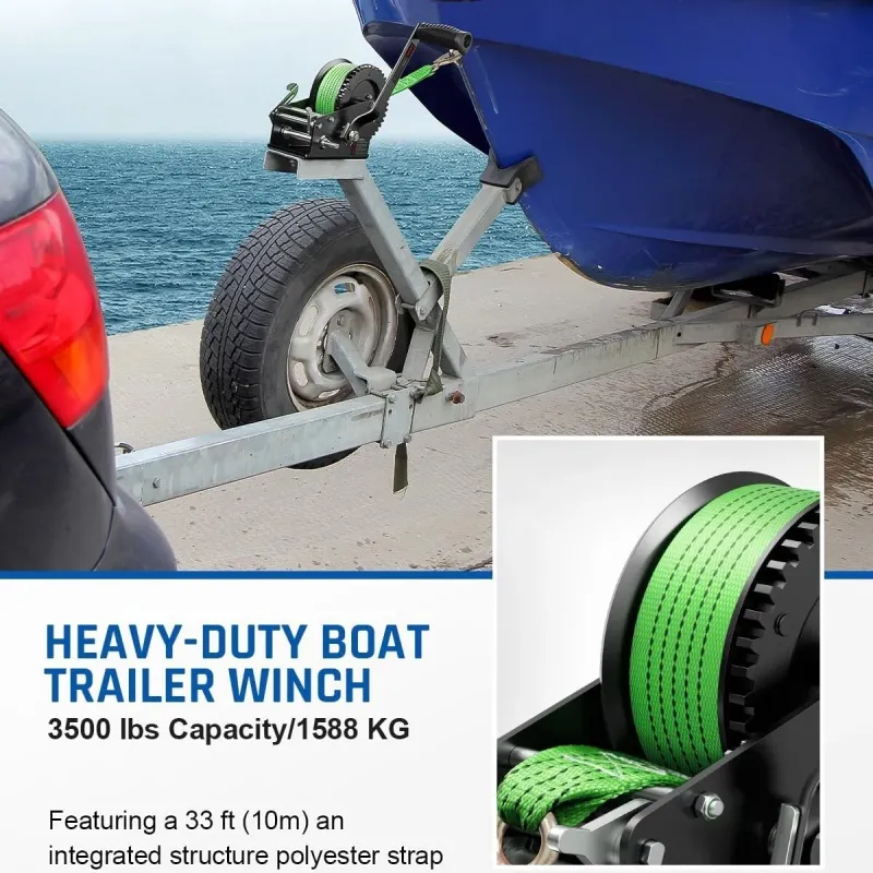 Heavy Duty 3500lbs Boat Trailer Winch with 33ft Green Strap Manual Winch Handle Dual Gear 4 1/8 1 Ratio for Boats Jet Skis Marine