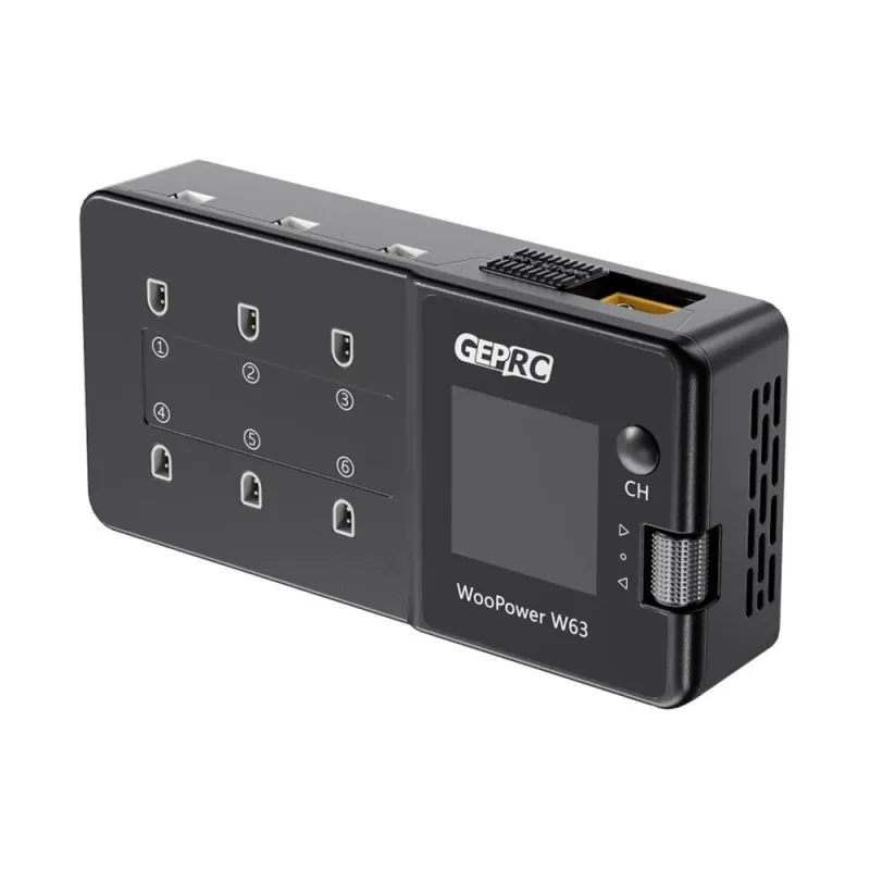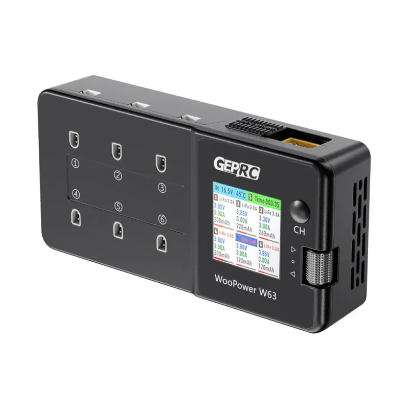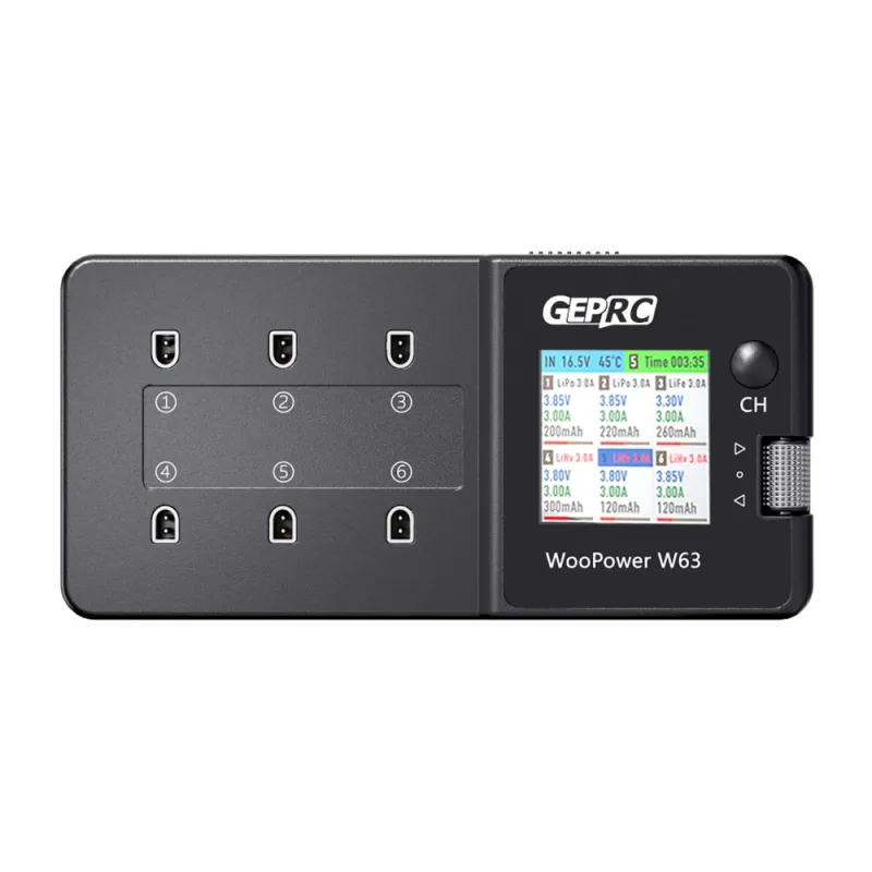 GEPRC WooPower W63 78W 3A*6 6 Ports 1S Lipo Battery Charger Discharger with Storage Function 1.54-Inch IPS Display Support LiPo/LiHV/LiFe 1S Battery PH2.0/BT2.0 Plug