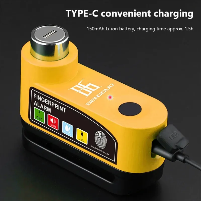 BENGGUO 120dB Bicycle Fingerprint Unlocking Disc Brake Lock USB Charging Waterproof Alarm Safety Protection Motorcycle E-Bike Anti-theft Lock
