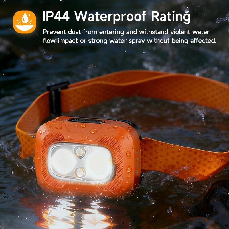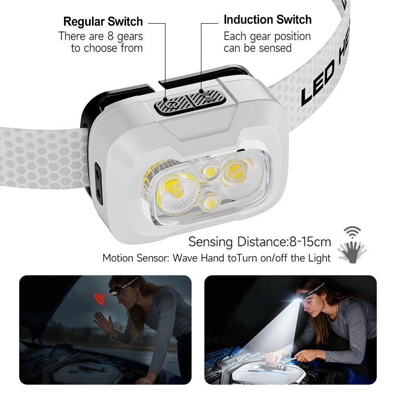 BIKIGHA39 550 Lumens Ultra-Bright Mini Sensor Headlamp Spotlight + Floodlight) Wave Sensing 3-Color Light IP44 Waterproof USB-Rechargeable for Camping Hiking