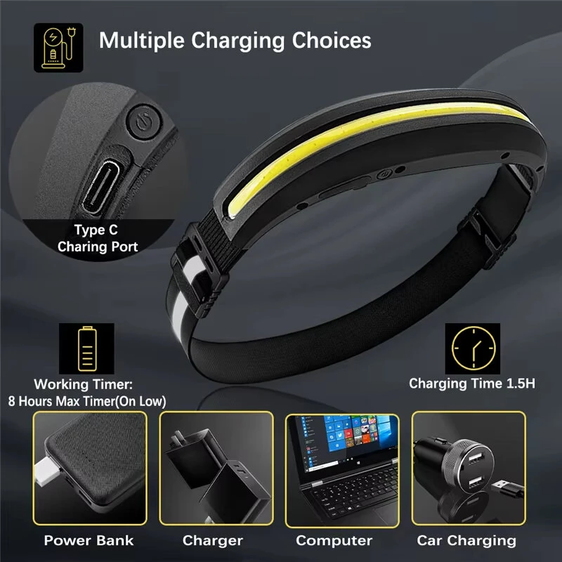 Lightweight Portable COB Headlamp Rechargeable Head Mounted Style Work Light Outdoor Camping Night Running Floodlight Fishing Headlight