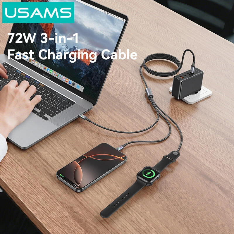 USAMS SJ754 3A 72W Type-C to Type-C+Type-C+iWatch Colorful Lighting Cable Fast Charging Data Transmission Tinned Copper Core Line 1.2M Long for iPhone 17 17Pro 16 15 Pro Max for HUAWEI for SAMSUNG for iWatch