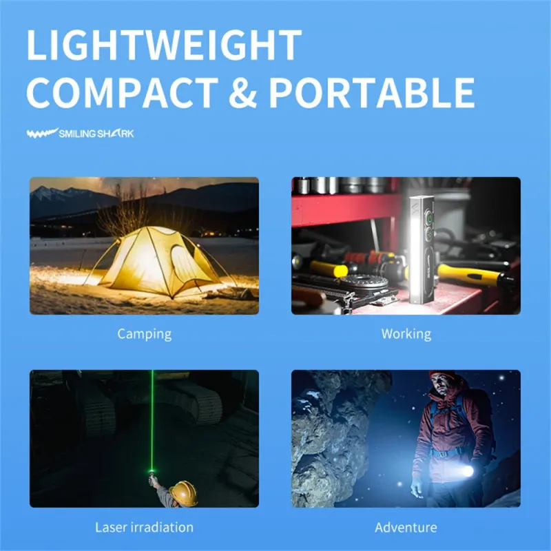 SMILING SHARK Multifunctional Type-Rechargeable Flashlight With Green Beam Light UV Light and Side Lights Waterproof with Magnetic Repair Work Lamp for Outdoor Fishing Hiking