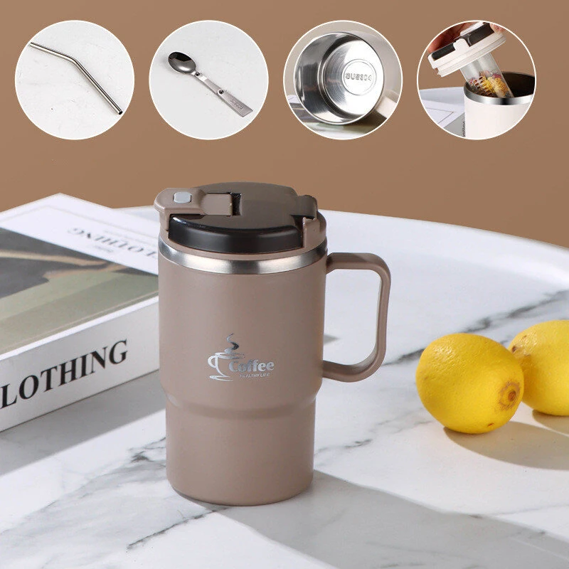 Double-Wall Coffee Office Mug 304 Stainless Steel Water Mug Cup With Spoon&Tea Strainer Leak Proof Anti Scalding Drinking Cup