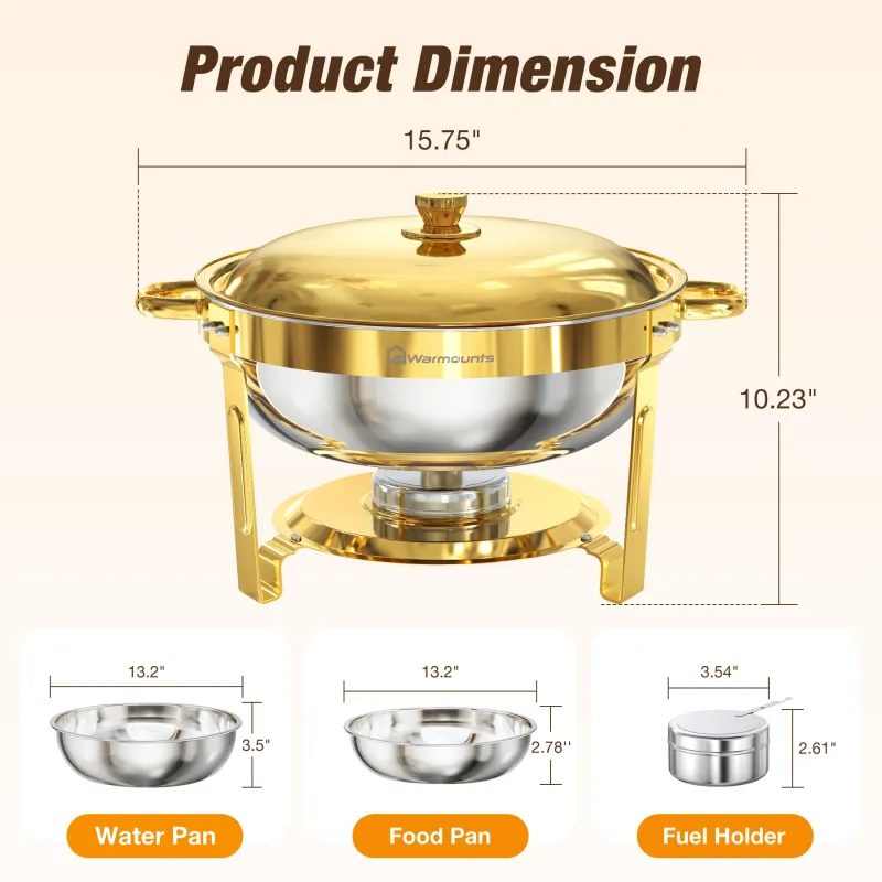 Warmounts Gold Chafing Dishes for Buffet (5QT, 2/4 Pack), Round Stainless Steel Chafer and Warmer Set with Lid Holder, Mirror-polished, Rolled Rim Process (No Finger Cuts), for Catering, Party, Wedding
