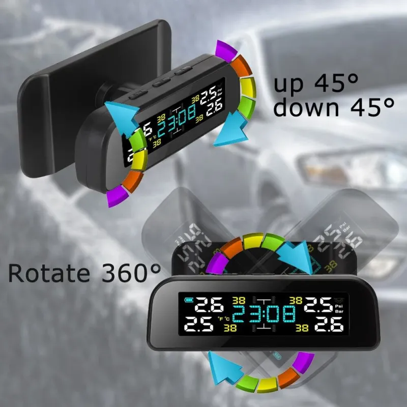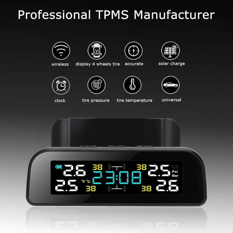 Tire Pressure Monitoring System Solar Clock LCD Display Car TPMS Wireless Tire Pressure Monitoring with 4 External Sensors