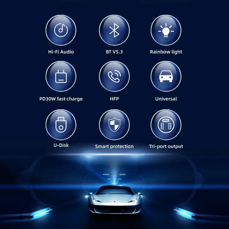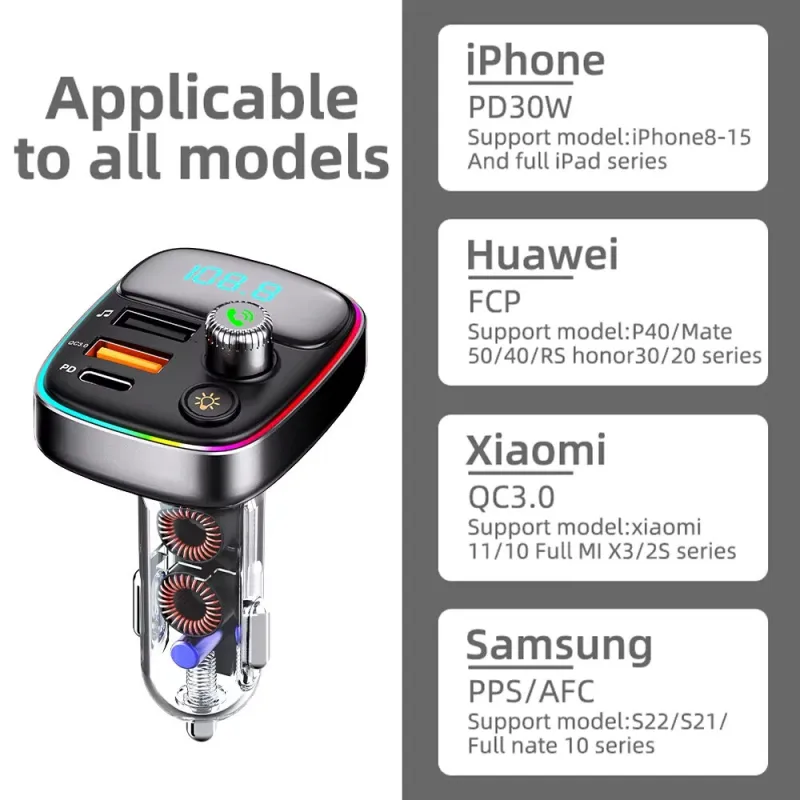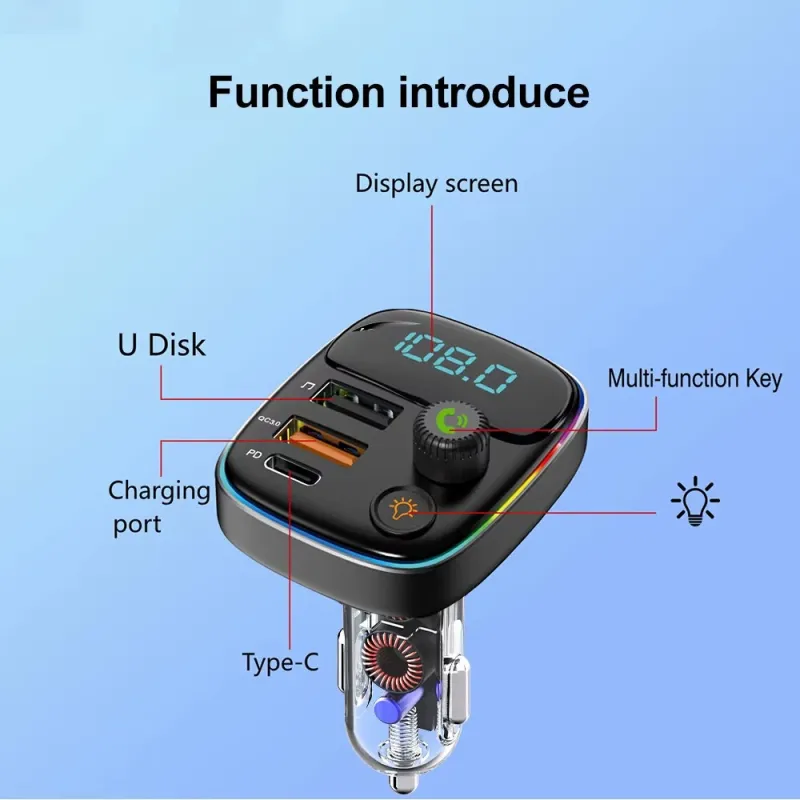 Car FM Transmitter PD Type C Dual USB Ambient Player MP3 Charger Bluetooth 5.3 Wireless Light Handsfree PD QC3.0