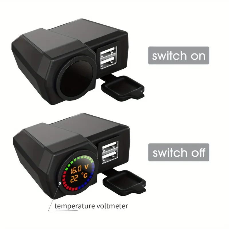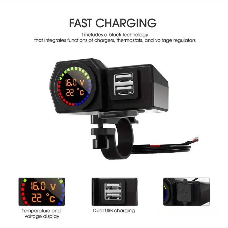 Motorcycle Charger Dual USB 5V 3A Fast Charging Digital Voltage Temperature Display Overcharge Protection Rearview Mirror Mount Adapter for iPhone Huawei GPS Devices