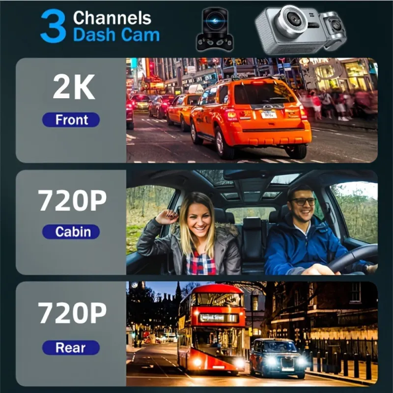 S2Q Dash Cam 3 Channel Front 2K Cabin 720P Rear 720P Wide Angle Lens Motion Detection G Sensor Loop Recording Night Vision Car Camera