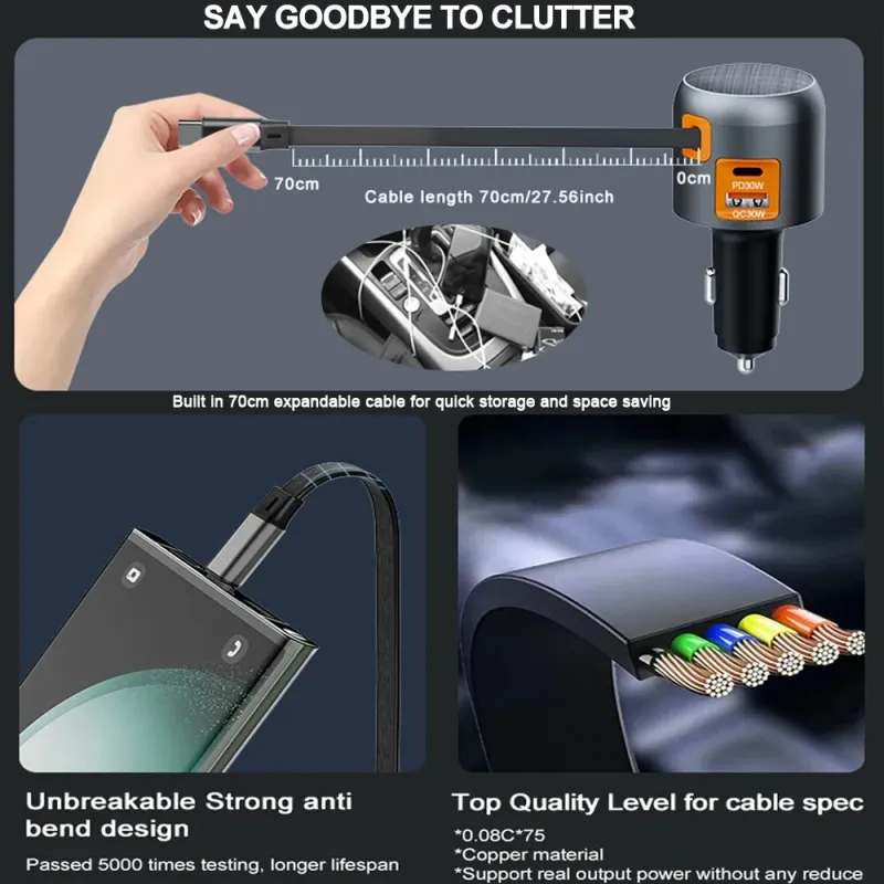 IBD IBD358 1U2C 60W PD30w QC30W 3-in-1 USB Car Charger Retractable Cable Multi-Port Fast Charging USB Type C Charger for Mobile Phone