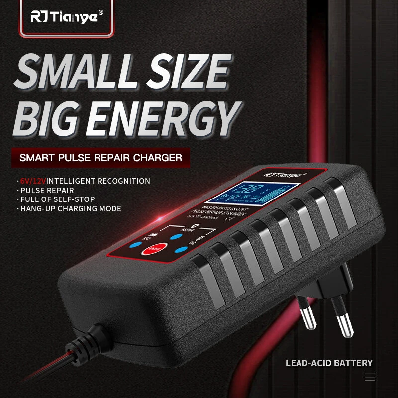 RJTianye 6V 12V 2A Car Smart Battery Charger ASE Adapter Automatic Float Charge Motorcycle Lawn Mower Tractor Lead Acid AGM Battery