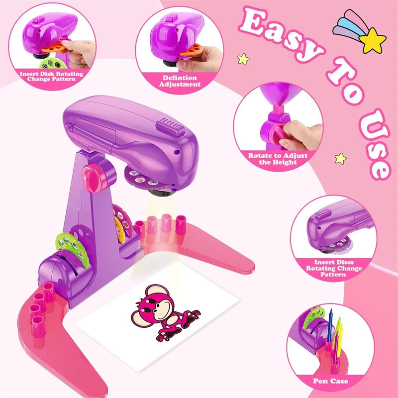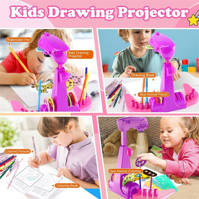 Children's Drawing Projector Toys Set with 32 Cartoon Slides and 12 Color Brushes for 3-6 Years Old Creative Painting Kit