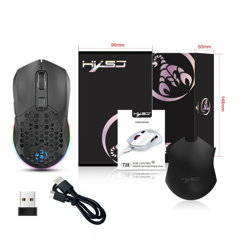HXSJ T28 Dual Mode Wireless Mouse Hollow Design 800-4800DPI RGB Backlight 600mAh Rechargeable 2.4G/bluetooth Gamer Mice