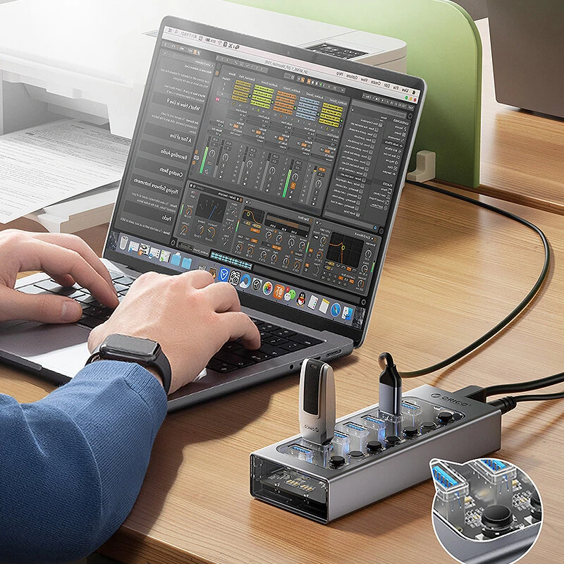 ORICO AT2U3 7-in-1 5Gbps USB 3.0 Hub Docking Station with Independent Power Switch 7xUSB-A Splitter Adapter for Macbook Mobile Phone Tablets
