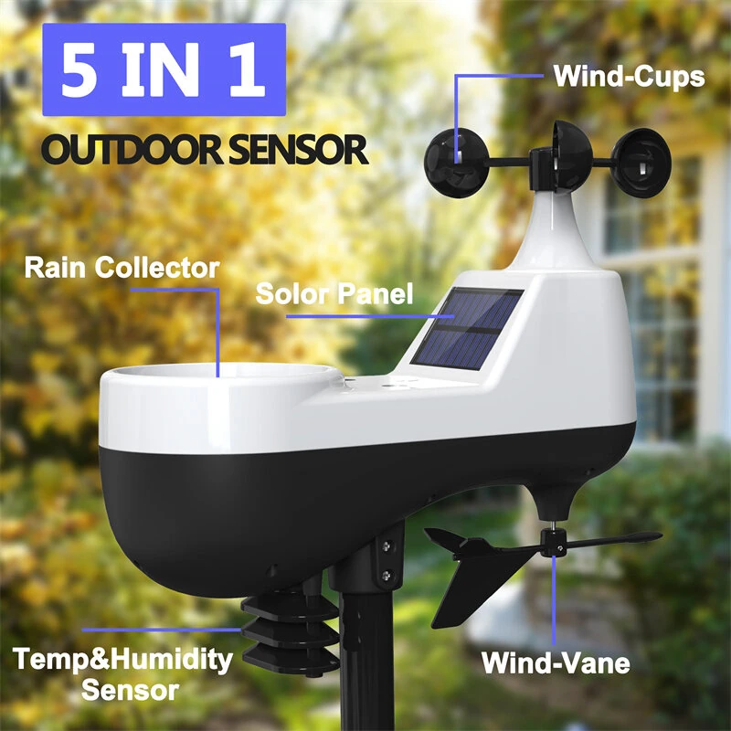 7.5" VA Tuya WiFi 5-in-1 Wireless Weather Station Auto Alarm Clock Temp-Humidity UV Sunlight Wind Rainfall Meter Solar Panel Forecast Sensor