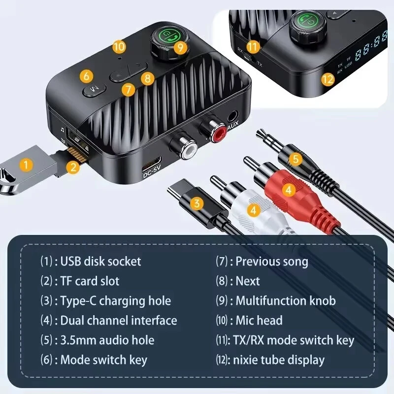 C68 bluetooth Adapter Transmitter Receiver 2 In 1 with Digital Display AUX USB TF Card Support HiFi Lossless Audio Wireless Music Streaming for TV Speaker