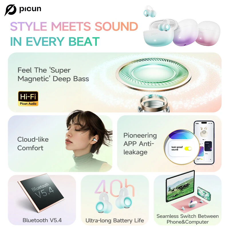 PICUN W5 TWS Earclip Earbuds Wireless bluetooth 5.4 Earphone HiFi Audio Deep Bass Dual-Mic AI Call Noise Reduction 40H Playback Lightweight Flexible Comfort Low Gaming Latency Sports Headphones