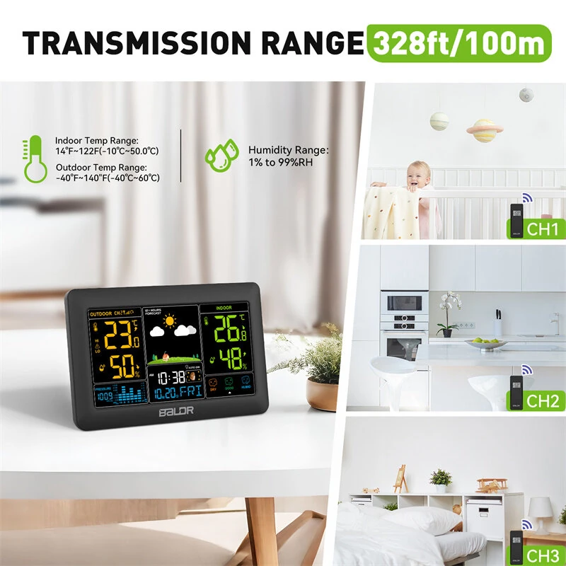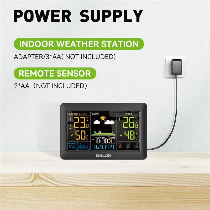 BALDR Wireless Weather Station 7.5" LCD Digital Humidity Temperature Meter Auto Alarm Clock Moon Phase Barometer Forecast Sensor