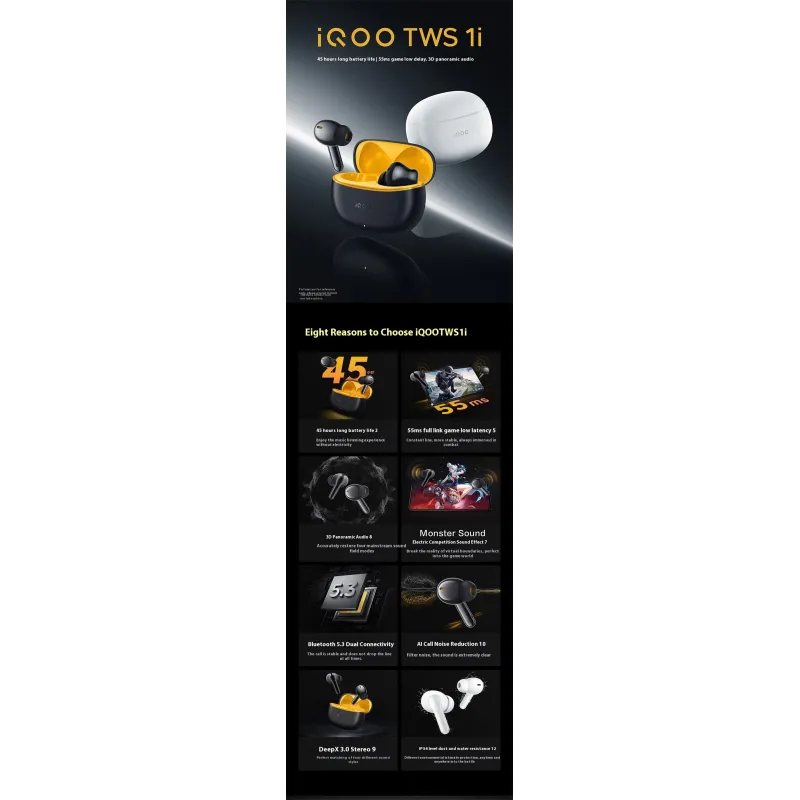 VIVO iQOO TWS 1i Wireless Headset bluetooth Earphone Low Gaming Delay 3D Surround Sound AI Call Noise Cancelling 45H Playback In-ear Sports Headphones with Mic