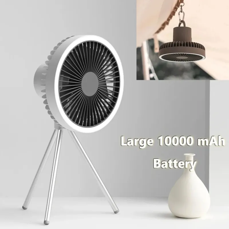 3 in 1 Multifunctional 10000mAh USB Rechargeable Camping Fan with LED Light High Capacity Silent Motor Long Battery Life Aluminum Tripod Desk Ceiling Fan Power Bank Function