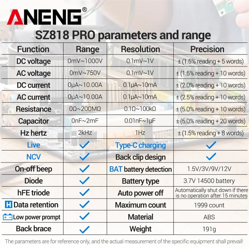 ANENG SZ818 SZ818PRO Digital Multimeter True RMS 1000V Voltage 10A Current Measurement Rechargeable Type-C Battery Detection Accurate NCV Tester Electrical Multimeter for Home and Industrial Use