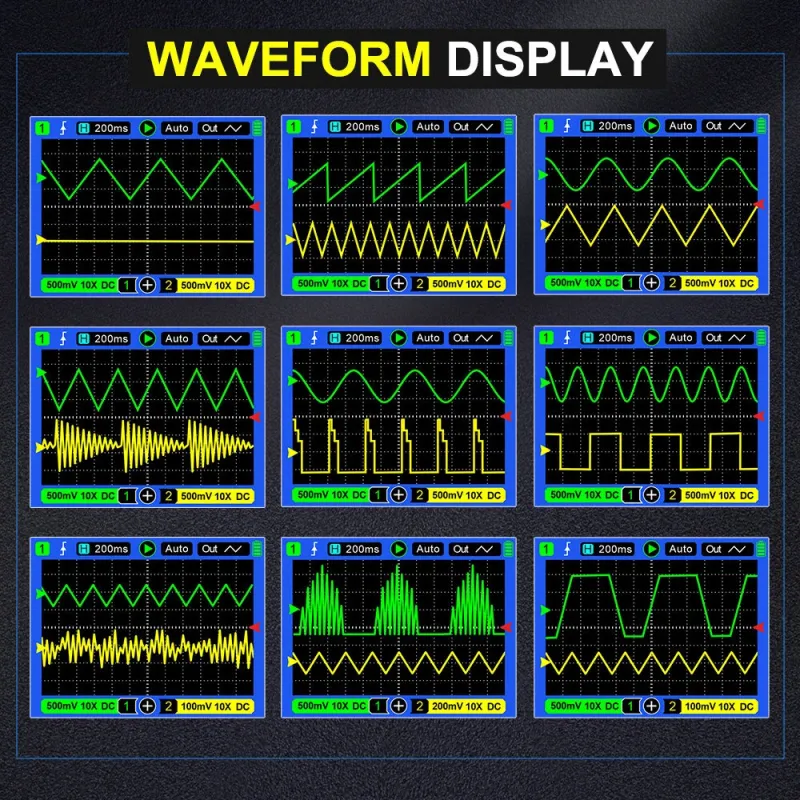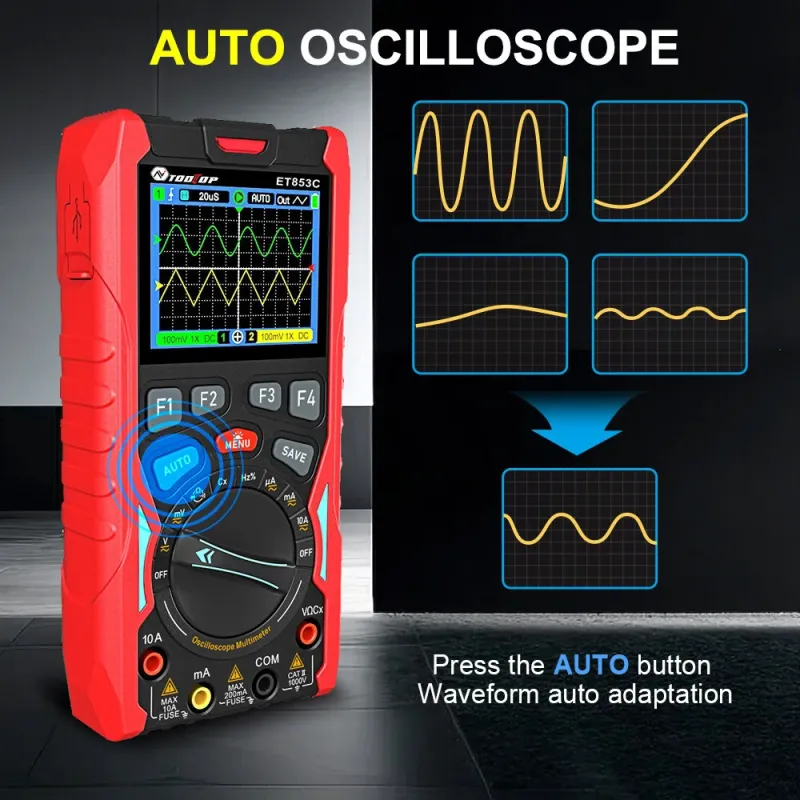 ET853C 3-in-1 2CH 70Mhz Oscilloscope Multimeter Signal Generator 3-In-1 200Msps Sampling Rate Bandwidth Dual Channel Color Screen Rechargeable Battery Auto Range Test Data Storage