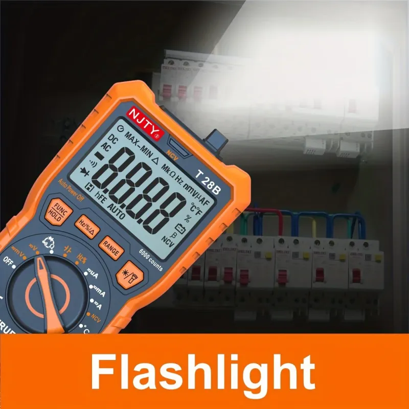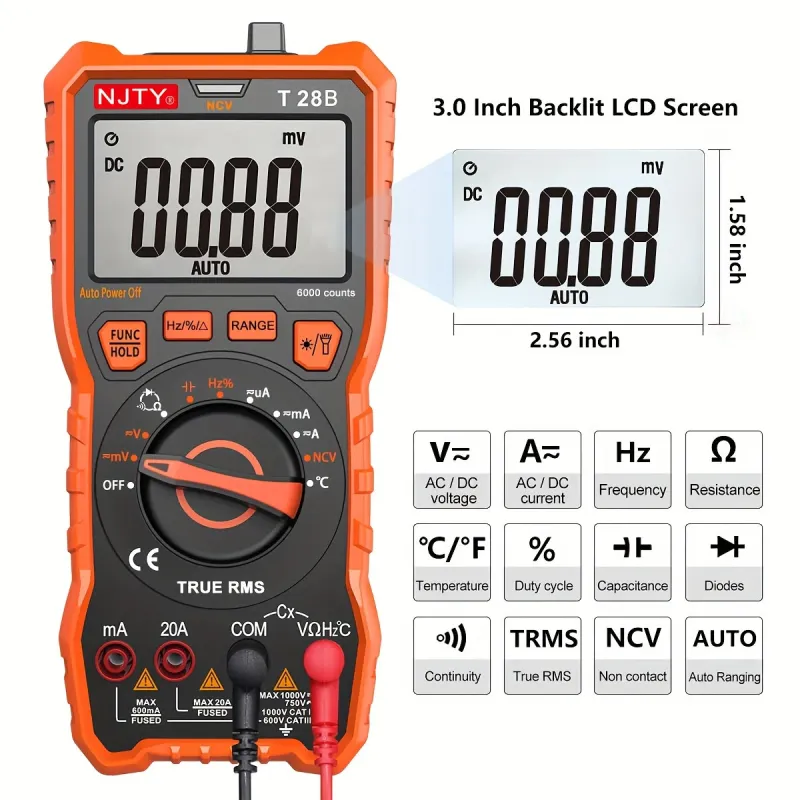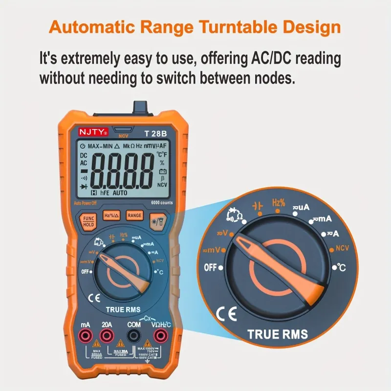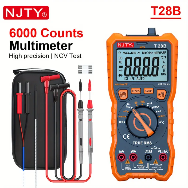 NJTY T28B TRMS Digital Multimeter 6000 Counts True RMS 20A Input AC DC Voltage Current Resistance Temperature Continuity Capacitance Measurement Battery Powered Non Slip