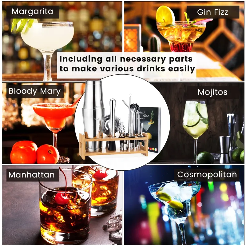 Stainless Steel 22oz Cocktail Shaker Set with Wood Stand - 16 Piece Bartender Kit with Drink Shaker, Bar Spoon, Jigger, Muddler, Strainer, Bottle Opener, Stopper, Pour Spout, Stirrers, Tongs, Recipes