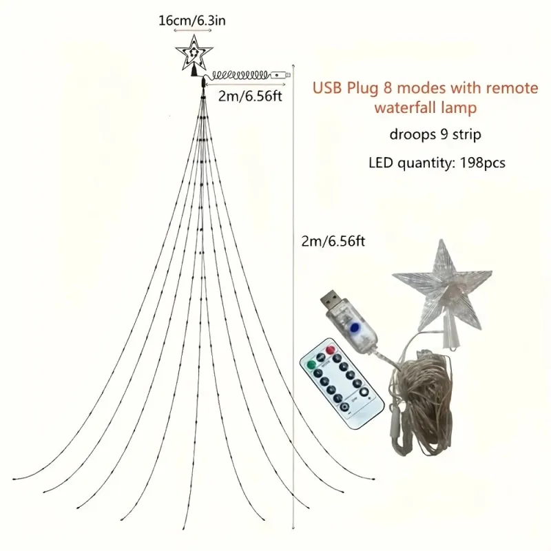 198 LED Five-Pointed Star Light Waterfall Light Water Trailing Light Christmas Holiday Decoration Light Garden Star Light String 8 Mode Function