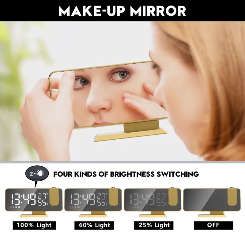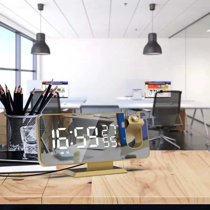 AGSIVO 7.4" LED Digital Projection Alarm Clock With FM Radio / Rotating Projector / Mirror Surface / Temperature Display / Humidity Display / Snooze / External USB Charger